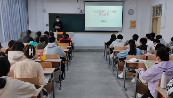 陈佳伟同学考研时选择跨考化工专业,将《化工原理》课程作为考试专业课,因此对该门课程学习有着丰富经验。他提出在学习时要注重逻辑分析,不能只追求记忆知识,在平时要紧抓课堂时间,高度重视课程学习,同时也要以独立的思维理解课程知识,遇到难以理解的问题是要及时寻求老师帮助。接着,陈佳伟便对自己的研究生跨考经历进行分享,讲解了跨考考研的注意事项:包括要清楚目标院校对该专业的要求,并以目标院校的录取要求进行考研备战。尤其着重指出,即使目标院校的专业知识要求与我院差距较大,但是作为专业根基的基础知识是相同的,打牢专业基础尤为关键。
